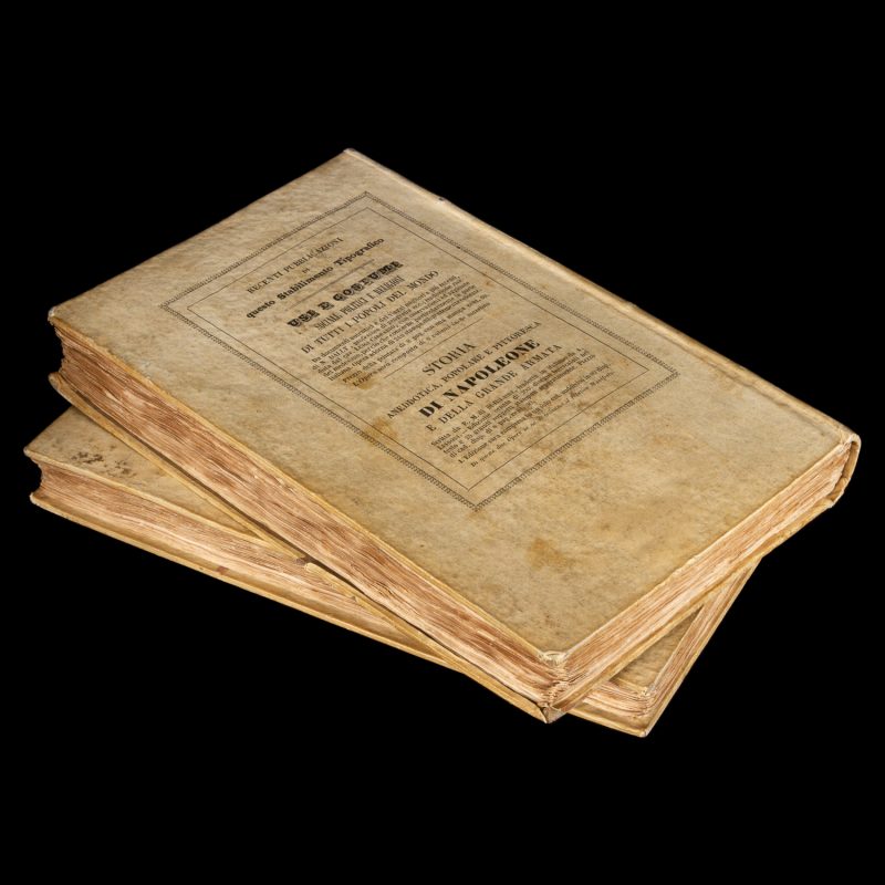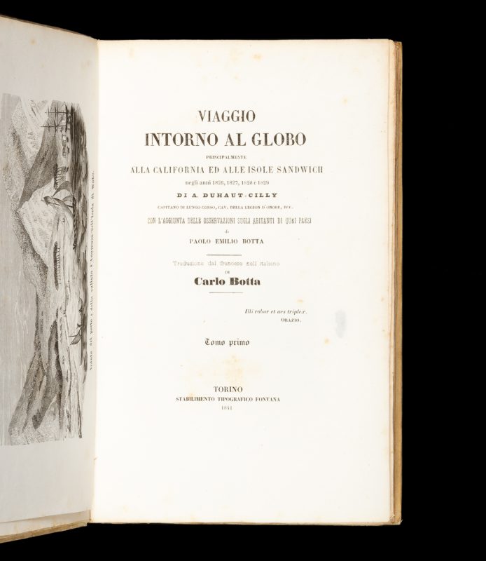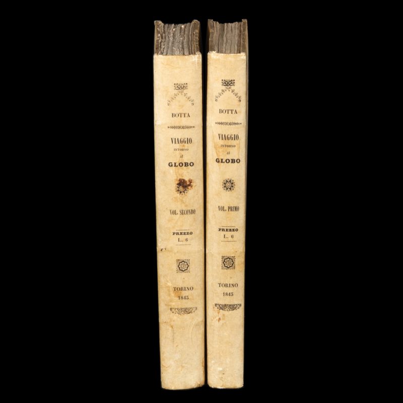 di A. Duhaut-Cilly con l’aggiunta delle osservazioni degli abitanti di quei paesi di Paolo Emilio Botta ; traduzione dal francese nell’ italiano di Carlo Botta. Torino : Stabilimento Tipografico Fontana, 1841. First Italian edition. (Note: although the imprint on the bindings is dated 1843, the title pages of both volumes have the date 1841). Two volumes, octavo (220 mm), original printed papered boards (one with scattered staining); xvi, 296; 392 pp. illustrated with 4 woodcut plates; occasional pale foxing, uncut, complete.
