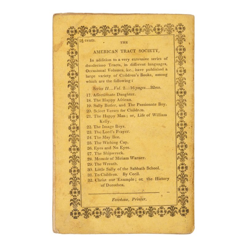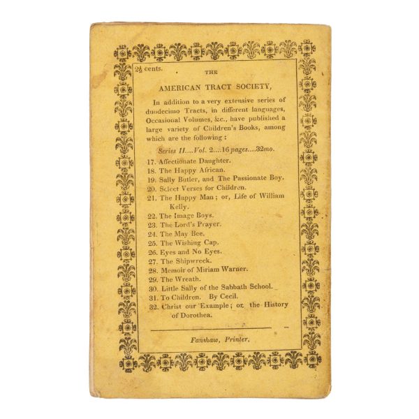 New York : American Tract Society, 144 Nassau-street, [1829]. At foot of wrapper title: Series IV., no. 1. Duodecimo (132 x 85 mm), illustrated yellow wrappers, stitch bound; original owner’s name (Charles A. Pierce, Groton, Mass.) to both sides of the upper wrapper; lower wrapper with publisher’s advertisement and Fanshaw, printer at foot; pp 36, illustrated with several vignette woodcuts in the text; a very good example.