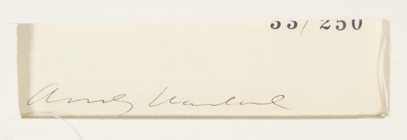 Warhol explored screenprinting while painting the Campbell’s Soup Can series, immediately drawn to its ability to replicate artworks and turn the artist ‘into a machine’. Warhol launched his printmaking business Factory Additions in 1967, where he would publish folios of screenprints of his most famous (and commercial) subjects. The first was his Marilyn series of 1967, followed by the Campbell’s Soup Cans in 1968. Each were a folio of 10 artworks, the Marilyn series of portraits of the movie star in a lurid combination of fluorescent colours, the Soup Cans a series of ten of the company’s most popular soups. The process of screenprinting allowed Warhol to create his Soup Can series as he had originally intended, as a series of near-identical images, appearing to be as mass produced as the cans themselves. The Campbell’s Soup Cans series ‘remain the most mechanical and uniform prints Warhol ever produced’ (Feldman & Schellmann (2015), p. 25.